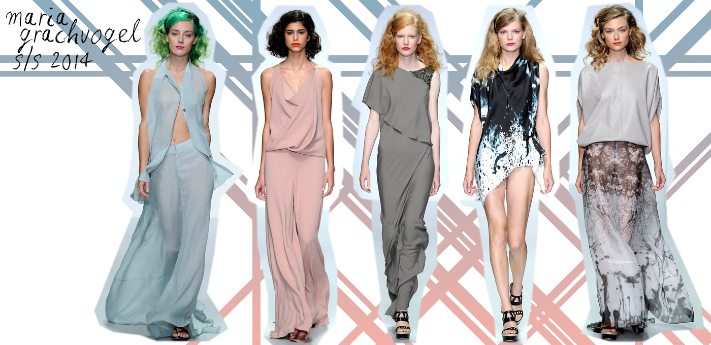 Maria Grachvogel's collection was very floaty and elegant. The pieces were made from light breezy fabrics that floated well on the catwalk. The pieces were mainly kept long and floor length with the occasional shorter piece hitting above the knee. As well as the floaty bottom halves draping the fabrics was also another way this designer added detail to the designs. The drapping worked well with the overall softer feel to the pieces. The colours were kept fairly natural with stoney, soft greys being used as well as variety of pastel colours, perfect for the Spring season. It wasn't just one block colour being used on these pieces, a fabric which looked like water marbling was also created. This looked very interesting on a number of designs as it was kept in a monochrome colour palette. Many of the fabrics were a lot lighter and sheerer than other collections seen this past week.